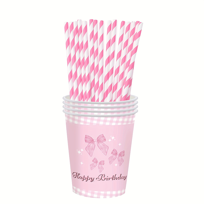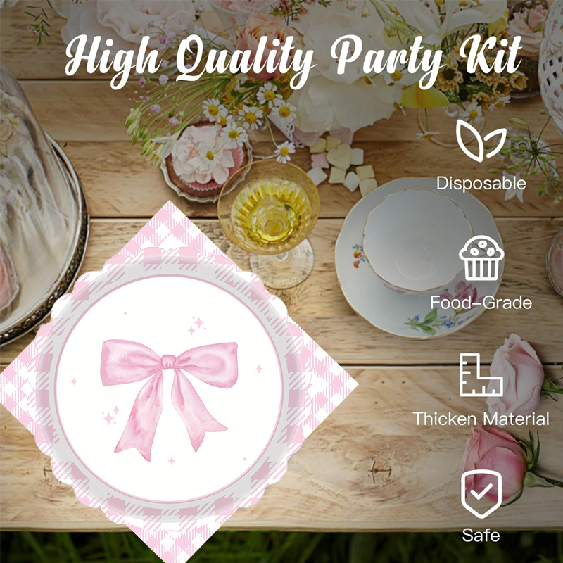 145pcs粉色蝴蝶结派对用品蝴蝶结生日盘餐巾 纸纸杯又蝴蝶结生日装饰女孩单身新娘订婚礼 帽可爱餐具套装可供24位客人使用