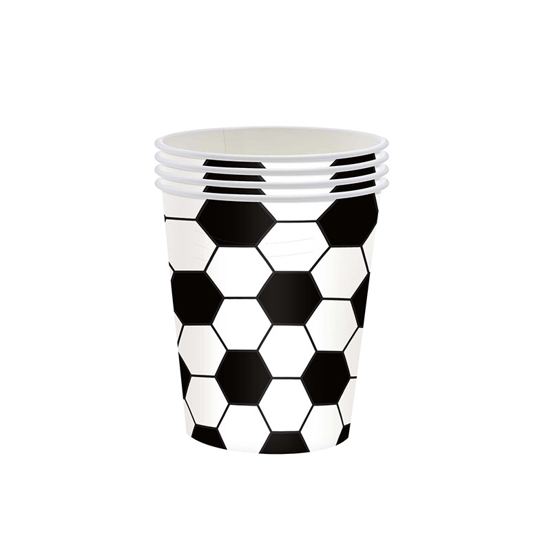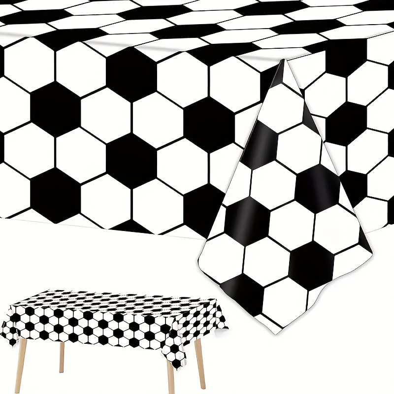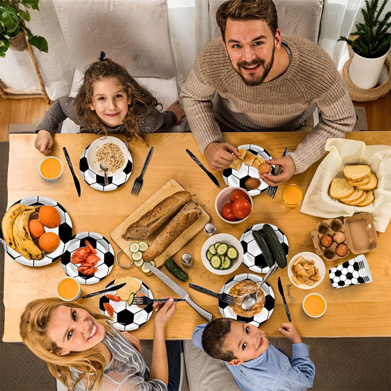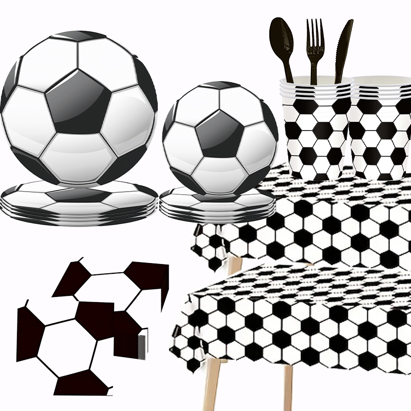 这是足球主题派对用品全套装,特点: 设计与品类:涵盖大小纸盘、纸杯、黑柄刀叉勺、足球纹理桌布,一站式配齐。以黑白足球六边形元素为核心,风格贯穿全品类,识别性强。 功能与场景:一次性设计,用餐、装饰、清洁便捷高效。适配足球球迷聚会、赛事观赛派对等运动主题场景。 风格价值:足球赛场风格,营造沉浸式观赛派对氛围。强化运动派对仪式感,满足个性化主题需求。