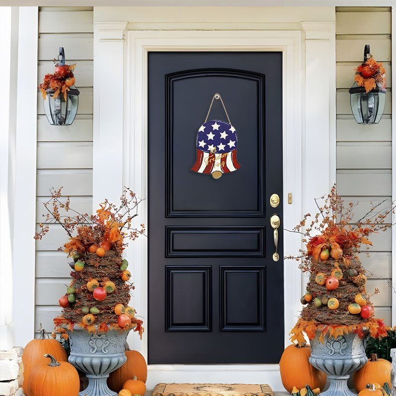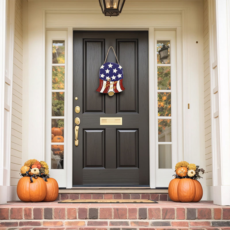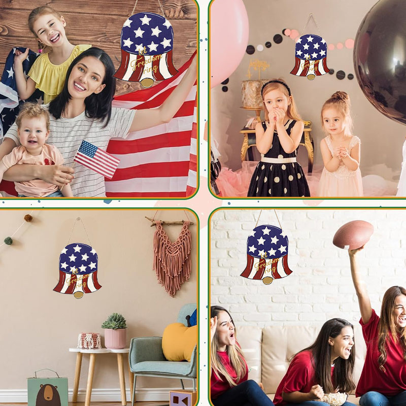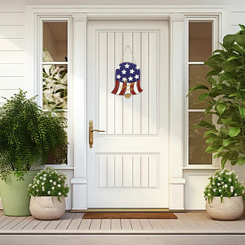 这是美国独立日装饰木质挂牌,特点: 设计与品类:品类为木质美式节日装饰挂件,设计融合钟形造型与 ** 美国星条旗(红白条纹 + 蓝色星区)** 元素,搭配麻绳挂绳,同时印有金色 “let freedom ring” 文字,造型极具美国独立日主题辨识度。 功能与场景:功能上可作为门饰、墙饰挂件,用于烘托美国独立日的节日氛围;场景适配家庭独立日布置、美式主题派对装饰、商铺节庆氛围营造等,为空间注入美式爱国节日的仪式感。 风格价值:风格偏向美式爱国风,通过星条旗元素与 “let freedom ring” 标语传递自由精神与美式文化;木质材质兼具手工质感与复古韵味,既是独立日的主题装饰单品,也可作为美式文化符号的软装,提升空间的节日纪念价值与文化氛围。