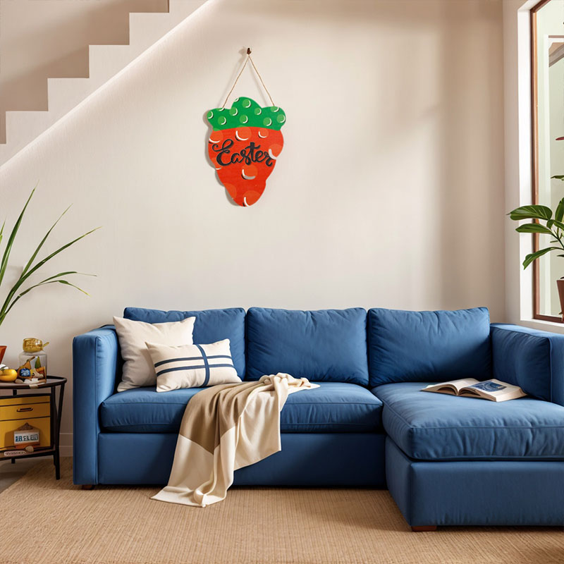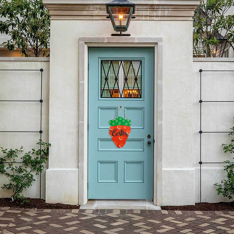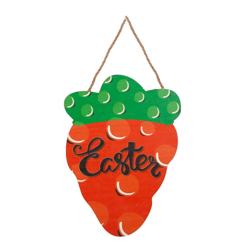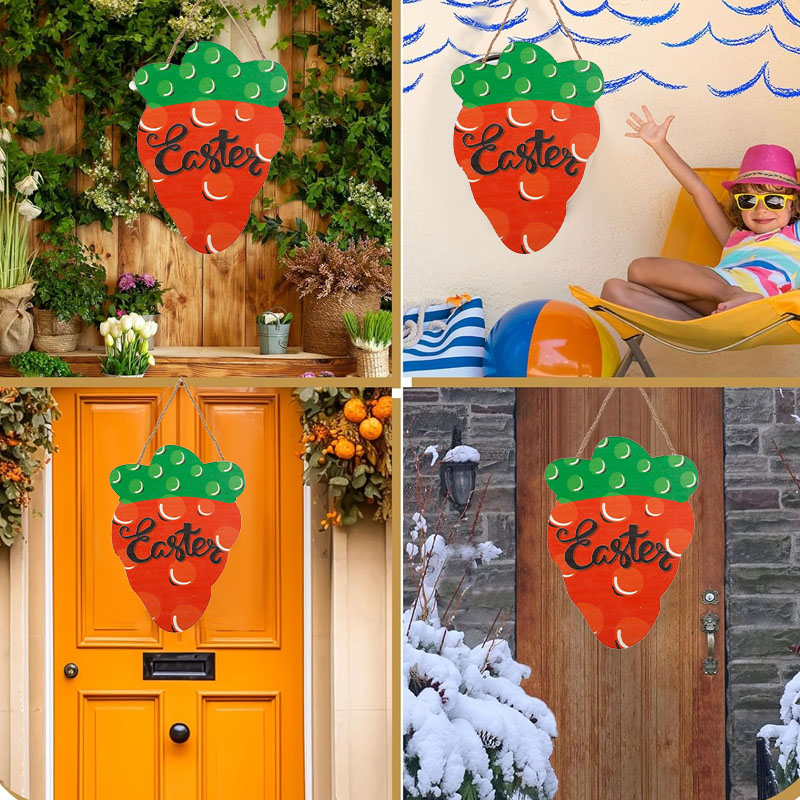这是木质复活节主题装饰挂件,特点: 设计与品类:设计融合胡萝卜造型(红色主体搭配绿色顶部,带有圆点装饰)与 “Easter” 艺术字体,搭配麻绳挂绳,造型鲜活且极具复活节主题辨识度。 功能与场景: 功能上可作为门饰、墙饰挂件,用于烘托复活节节日氛围;场景适配家庭复活节布置、节日派对装饰、商铺节庆氛围营造等,为空间注入童趣满满的节日仪式感。 风格价值维度:风格偏向清新童趣的节日艺术风,以胡萝卜元素和 “Easter” 标语传递复活节的欢乐气息;木质材质兼具手工质感与自然温度,既是节日装饰单品,也可作为复活节主题的情感化软装,提升空间的节日纪念价值与温馨氛围。