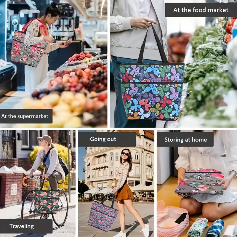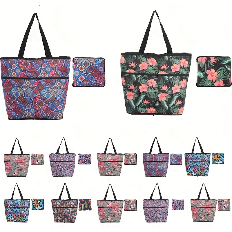 图案丰富,风格多样:涵盖民族风、热带风、复古风等多种印花风格,满足不同审美偏好,可根据穿搭和场景灵活选择,为造型增添个性亮点。 折叠设计,便携性强:托特包可折叠收纳成小巧的配套小包,节省空间,便于随身携带或存放,是旅行、通勤时的实用选择。 大容量,实用性高:展开后为大容量托特包,可容纳日常用品、购物物品等,满足多场景的装载需求,兼顾美观与实用。 套装配置,性价比优:每套包含托特包和配套小包,多套不同图案的组合提供了丰富的选择,性价比突出,适合自用或作为礼品分享。