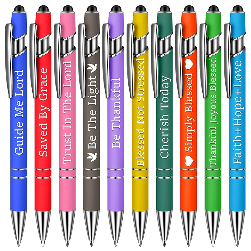 设计与品类:属于信仰励志主题圆珠笔品类,拥有缤纷多元的色彩(蓝、红、粉、灰、紫、黄、绿、橙等),笔身刻有 “Guide Me Lord”“Saved By Grace” 等多样励志信仰文字,部分款式搭配小鸟、爱心图案,设计风格富有精神内涵且视觉辨识度高,是融合书写功能与情感表达的特色文具品类。 功能与场景:具备书写与触控双重功能,圆珠笔书写流畅,笔顶触控头可适配触屏设备;适用于宗教活动纪念礼品、励志礼物赠送(如向亲友传递正能量)、日常办公学习书写,也可作为信仰文化传播载体,满足多元场景的书写与情感表达需求。 风格价值;;主打信仰励志风格,通过多样励志文字与缤纷色彩,传递信仰、感恩、希望等正能量价值观,既满足书写工具的实用性需求,又能为使用者带来精神激励,是表达信仰、传递正能量的个性化文具,为书写注入情感与精神价值。