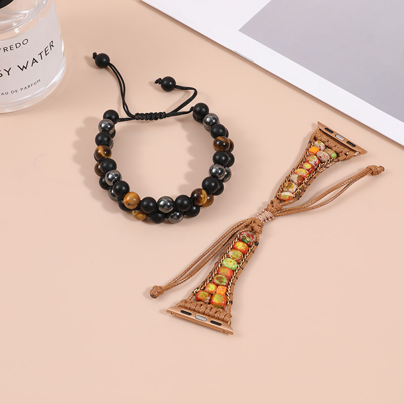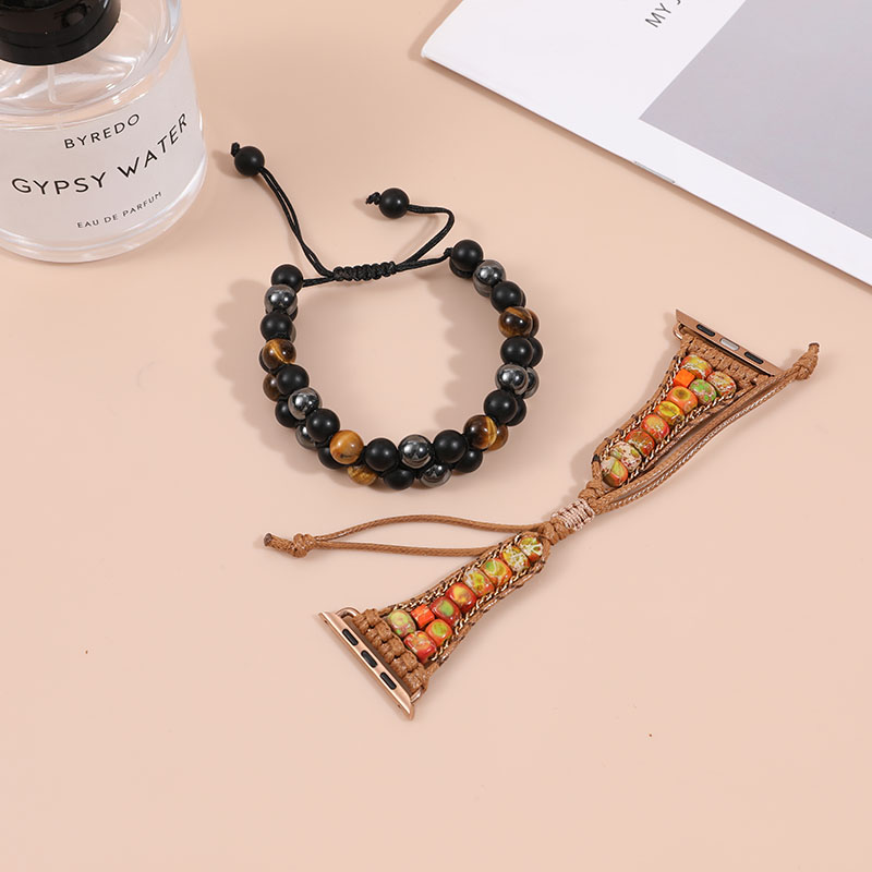 设计与品类:品类为天然石串珠手链 + 手工编织 Apple Watch 表带套装,属于时尚配饰品类。设计上采用虎眼石、绿松石等多种天然石串珠,结合手工编织工艺,款式丰富,每款都有独特的石材质感与色彩搭配,为配饰品类注入自然与手工艺术的双重设计感。 功能与场景:手链可作为日常穿搭的个性配饰,提升造型的艺术感;手表带适配 Apple Watch,实现智能手表的风格个性化改造,同时天然石材质兼具装饰性与质感。适用于日常出街、休闲聚会等穿搭场景,满足 Apple Watch 用户对表带风格升级的需求,也可作为小众配饰礼物送给风格爱好者。 风格价值:风格多元,融合天然石的自然复古感与手工编织的小众潮流感,打造出独特的艺术腔调,适配街头、复古等多种穿搭风格。价值上兼具实用性与审美性,是彰显个人品味的时尚载体,既满足配饰的功能需求,又能为穿搭增添层次感与小众设计感,契合消费者对个性化、艺术化生活方式的追求。
