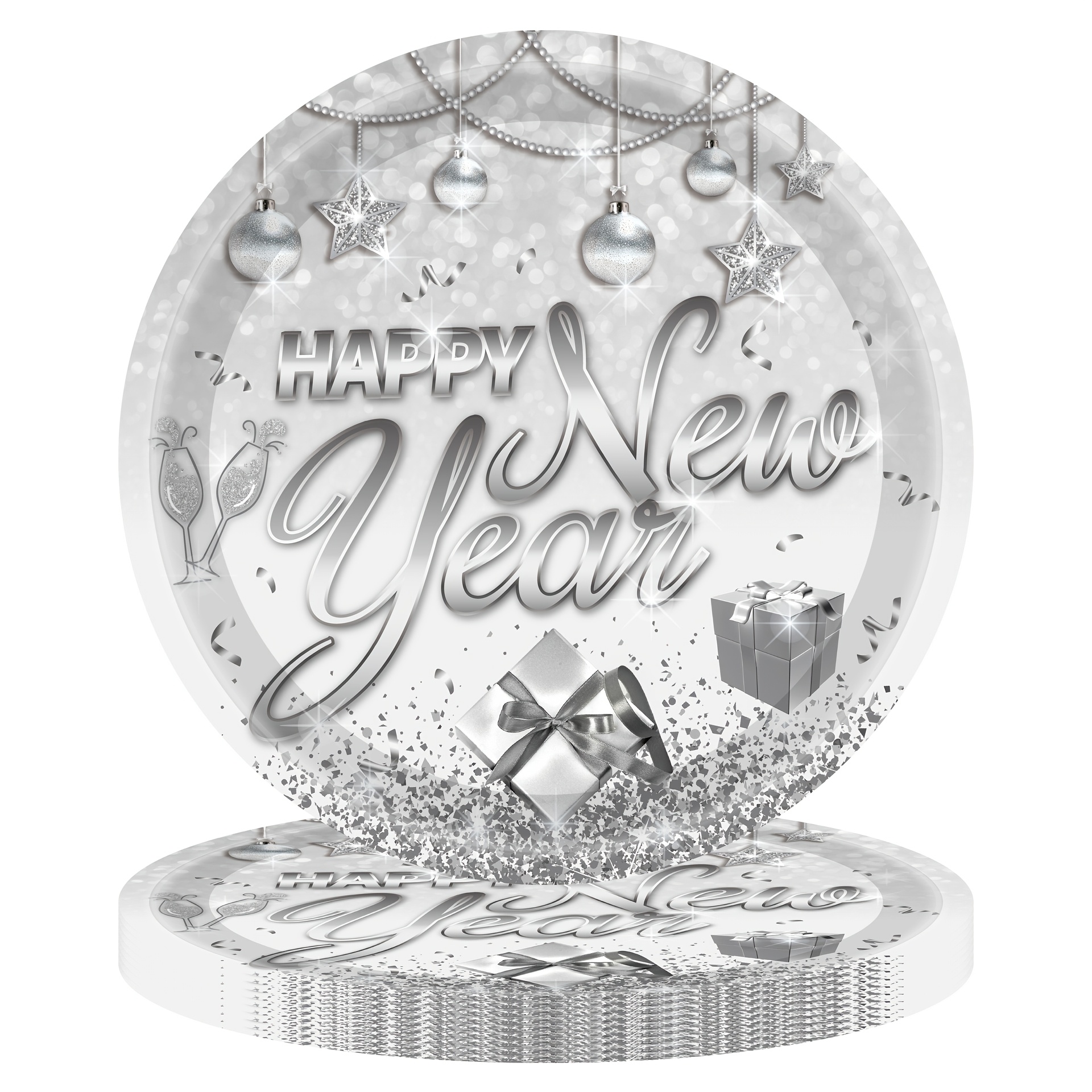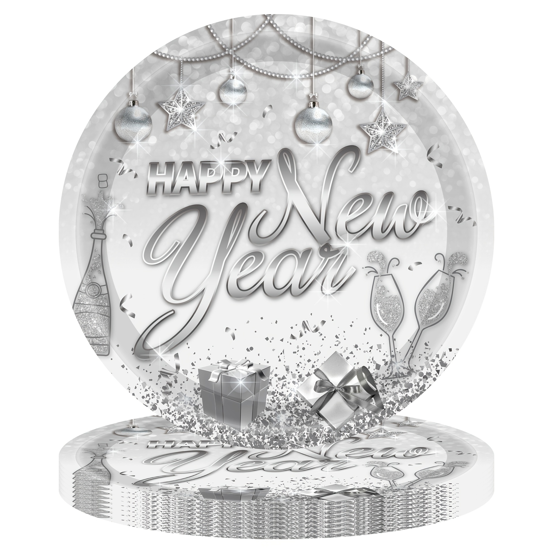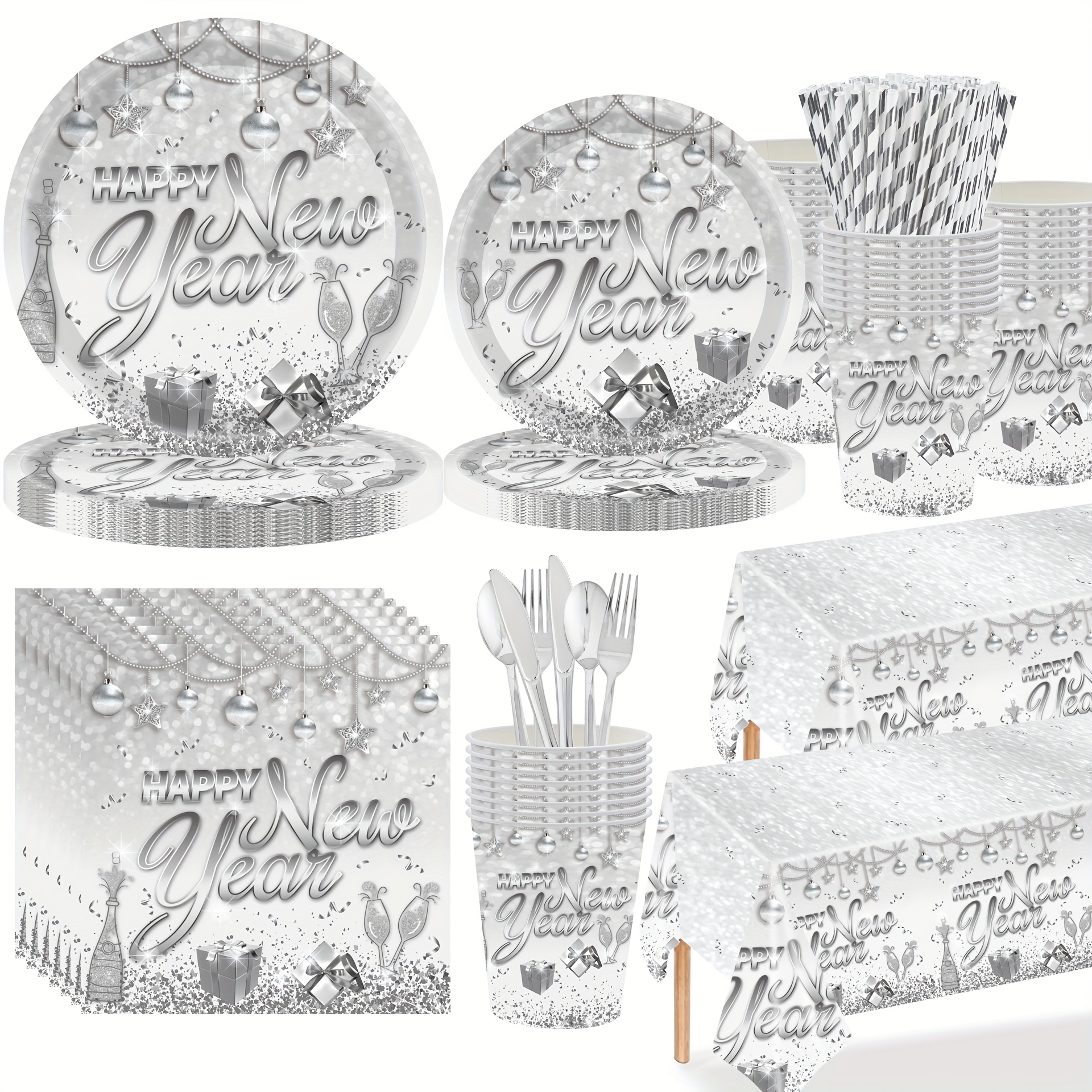 设计与品类 品类为新年主题轻奢派对用品套装,涵盖餐盘(多尺寸)、纸杯、金属质感餐具(刀叉勺)、纸巾、桌布、吸管等全品类派对物资;设计上采用银色系轻奢风格,融合香槟、礼物盒、装饰球、“Happy New Year” 艺术字等新年元素,搭配闪粉质感,视觉上充满华丽的跨年仪式感,属于一站式、主题化的高端派对用品集合。 功能与场景 功能:一站式满足新年派对的用餐、装饰、收纳需求,一次性材质便于派对后快速清理,全品类用品的统一设计强化新年奢华氛围;金属质感餐具提升用餐质感,闪粉元素在灯光下更显派对格调。 场景:适配新年倒数派对、元旦家庭聚会、公司新年年会、高端跨年主题活动等场景,也可用于商场新年促销活动、私人会所跨年布置,快速营造沉浸式新年庆祝氛围。 风格价值 风格:主打轻奢华丽的跨年风格,银色闪粉与精致新年元素(香槟、礼物)结合,传递出高端、喜庆的跨年格调,契合人们对新年 “仪式感 + 精致感” 的双重追求。 价值:具备氛围营造与高端仪式感价值,沉浸式的轻奢设计能瞬间拉升新年派对的奢华档次,满足用户对跨年活动 “格调升级” 的需求;同时一次性用品的实用性让派对筹备更高效,是兼顾 “高端感” 与 “便捷性” 的新年派对解决方案。