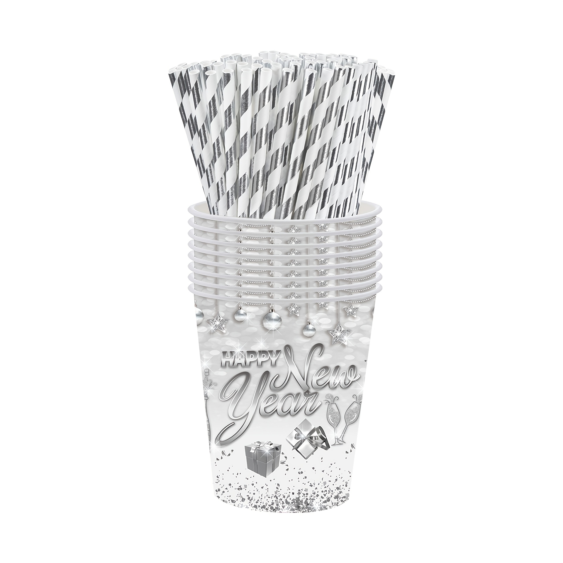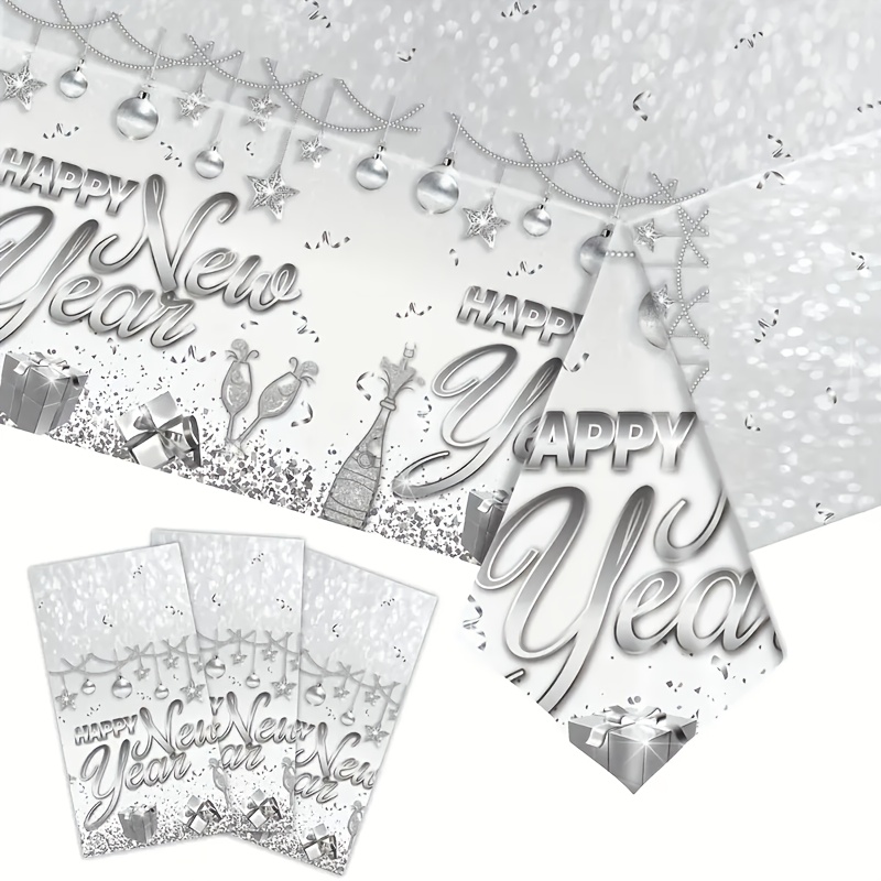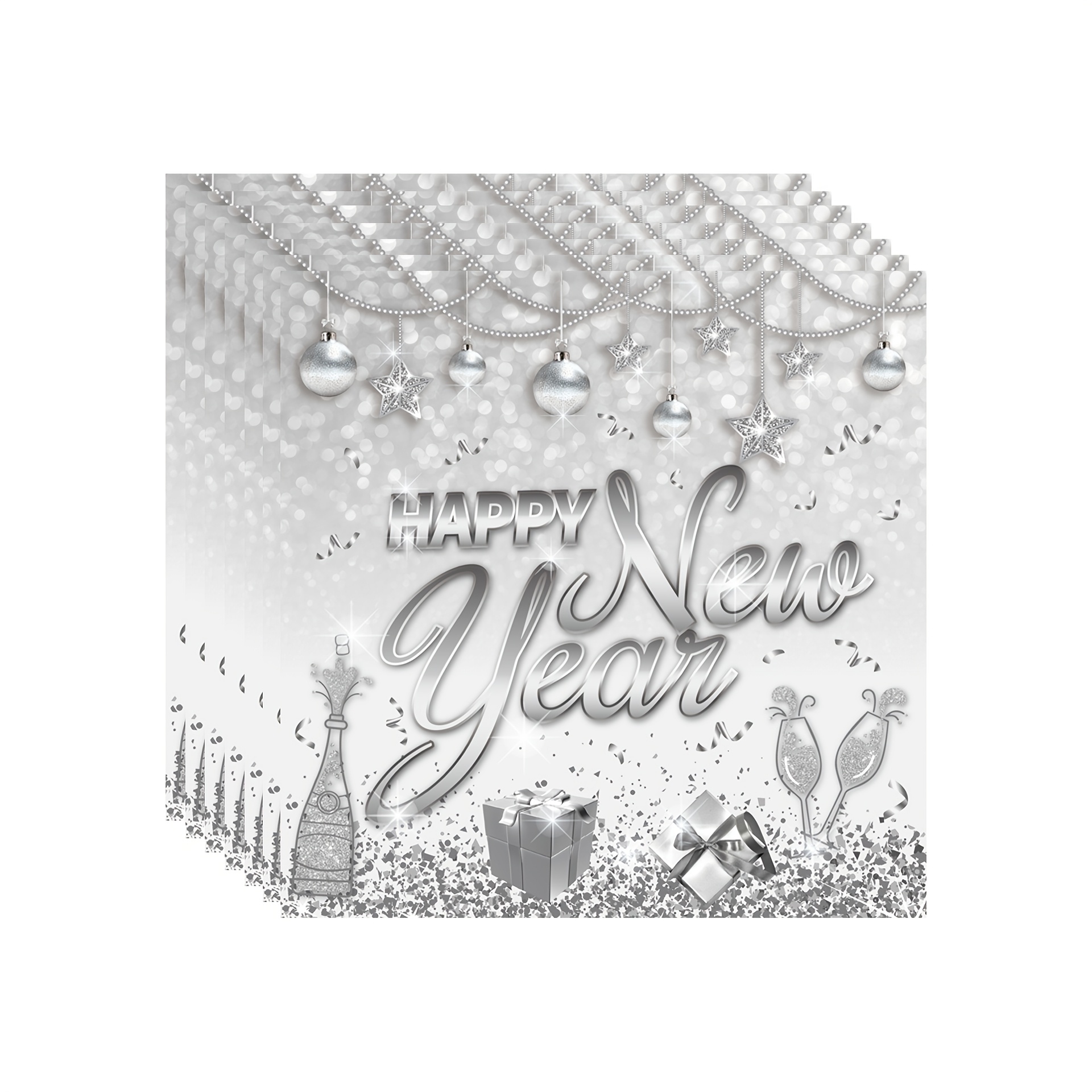 设计与品类 品类为新年主题轻奢派对用品套装,涵盖餐盘(多尺寸)、纸杯、金属质感餐具(刀叉勺)、纸巾、桌布、吸管等全品类派对物资;设计上采用银色系轻奢风格,融合香槟、礼物盒、装饰球、“Happy New Year” 艺术字等新年元素,搭配闪粉质感,视觉上充满华丽的跨年仪式感,属于一站式、主题化的高端派对用品集合。 功能与场景 功能:一站式满足新年派对的用餐、装饰、收纳需求,一次性材质便于派对后快速清理,全品类用品的统一设计强化新年奢华氛围;金属质感餐具提升用餐质感,闪粉元素在灯光下更显派对格调。 场景:适配新年倒数派对、元旦家庭聚会、公司新年年会、高端跨年主题活动等场景,也可用于商场新年促销活动、私人会所跨年布置,快速营造沉浸式新年庆祝氛围。 风格价值 风格:主打轻奢华丽的跨年风格,银色闪粉与精致新年元素(香槟、礼物)结合,传递出高端、喜庆的跨年格调,契合人们对新年 “仪式感 + 精致感” 的双重追求。 价值:具备氛围营造与高端仪式感价值,沉浸式的轻奢设计能瞬间拉升新年派对的奢华档次,满足用户对跨年活动 “格调升级” 的需求;同时一次性用品的实用性让派对筹备更高效,是兼顾 “高端感” 与 “便捷性” 的新年派对解决方案。