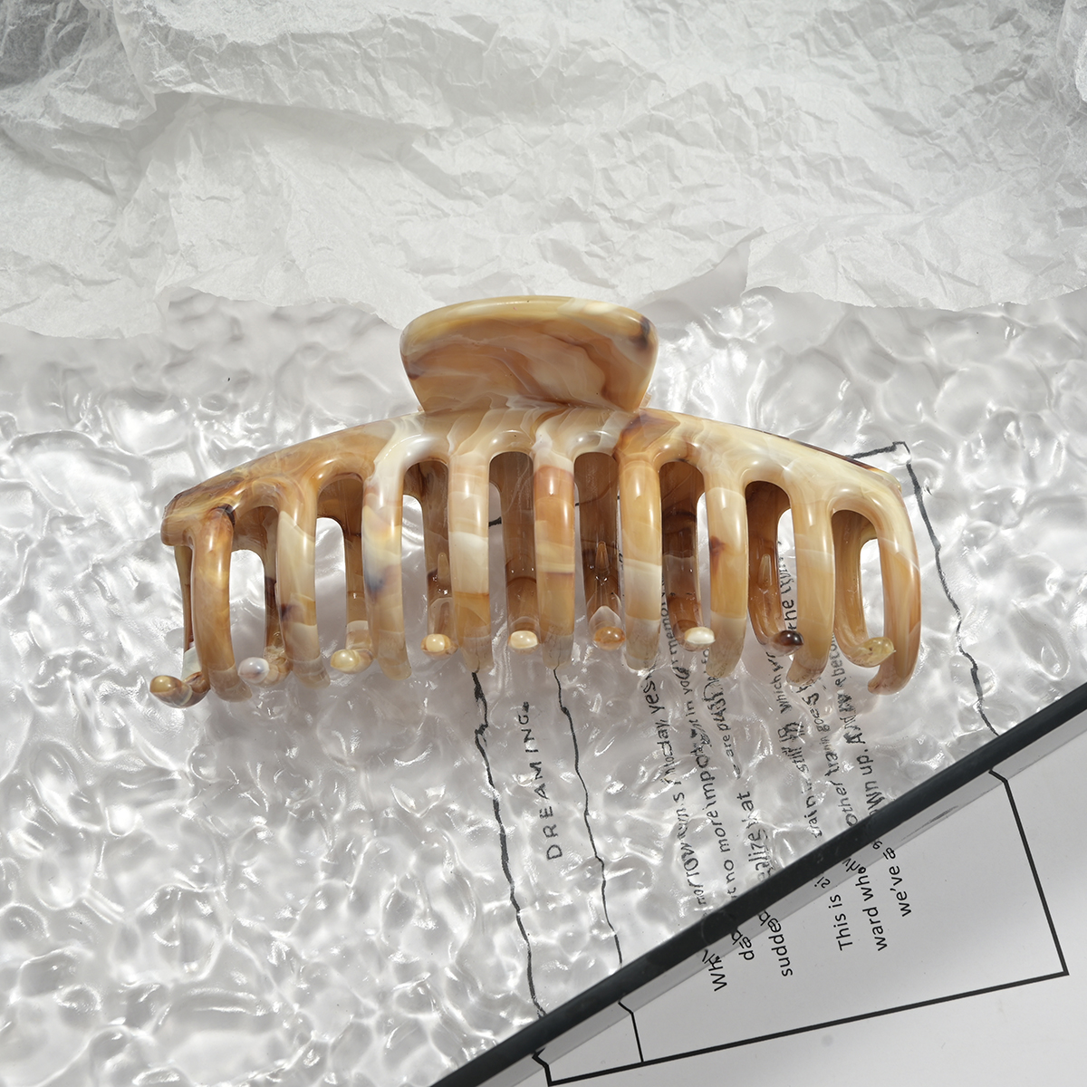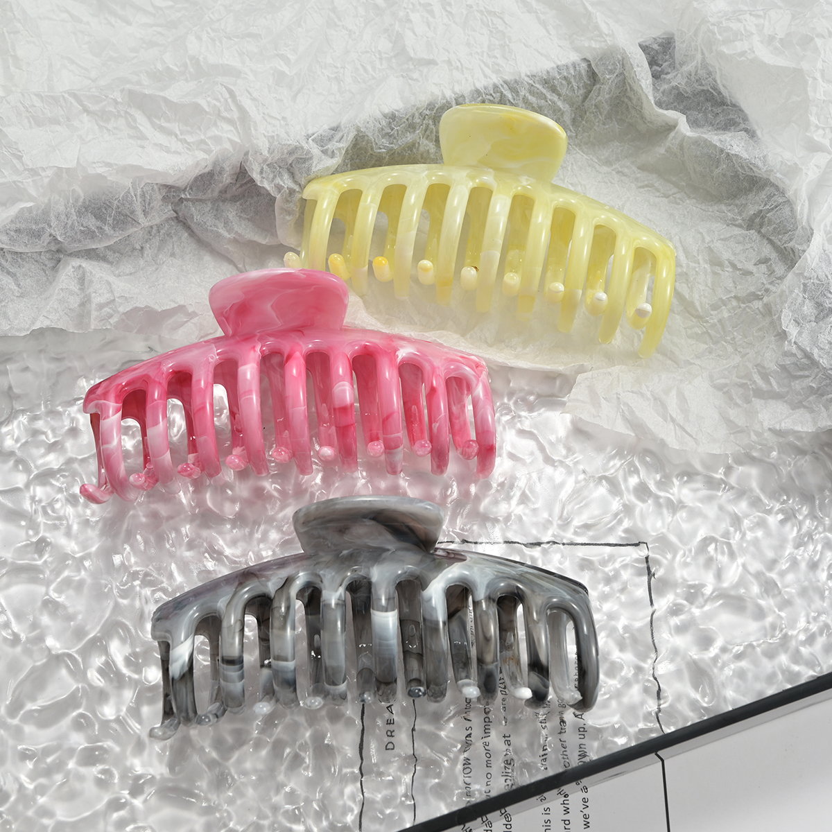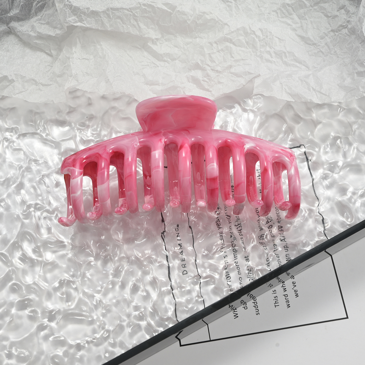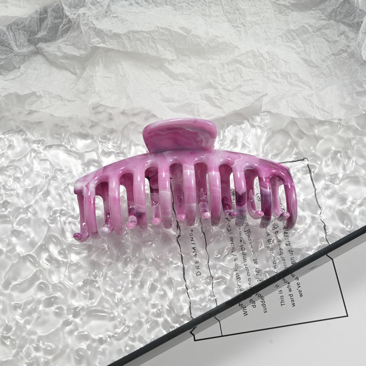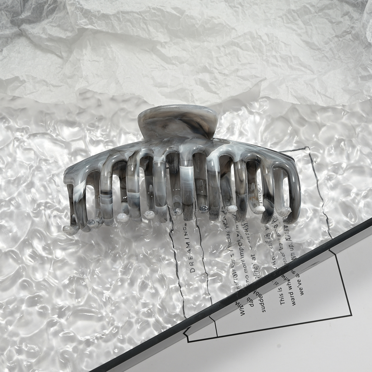 这是一款晕染大理石纹抓夹,走的是“轻奢氛围感+实用精致”路线,亮点很戳精致女生: • 材质与颜值:采用醋酸纤维打造,自带天然晕染纹理(粉/黄/紫/蓝/灰/棕6色),质感像“流动的玉”;精致不浮夸,光线下自带温柔光泽,显贵不廉价。 • 设计细节:宽齿+弧形贴合设计,抓发面积大,搭配弹力卡扣,厚发/多发包得住、不滑落;珍珠是嵌入式固定,不会轻易掉落,耐用性更高。 • 场景适配:大号尺寸适配各种发型,盘高颅顶丸子头、半扎发都很出片;日常通勤显气质,约会/下午茶搭小裙子更添温柔感,是“随手一夹就显贵”的精致配饰。