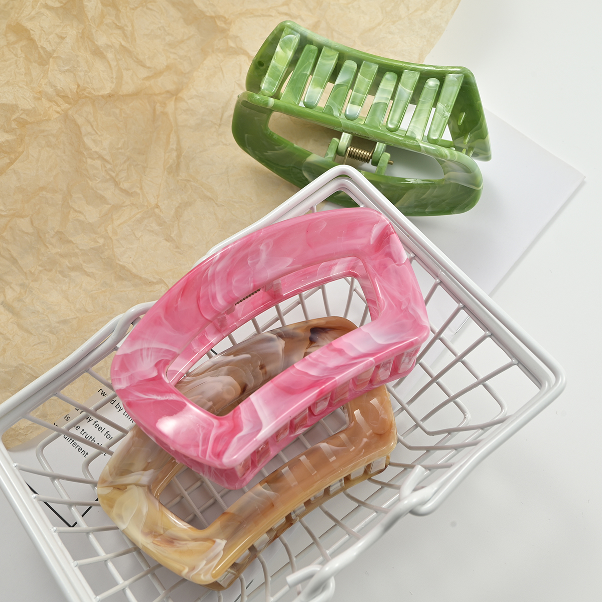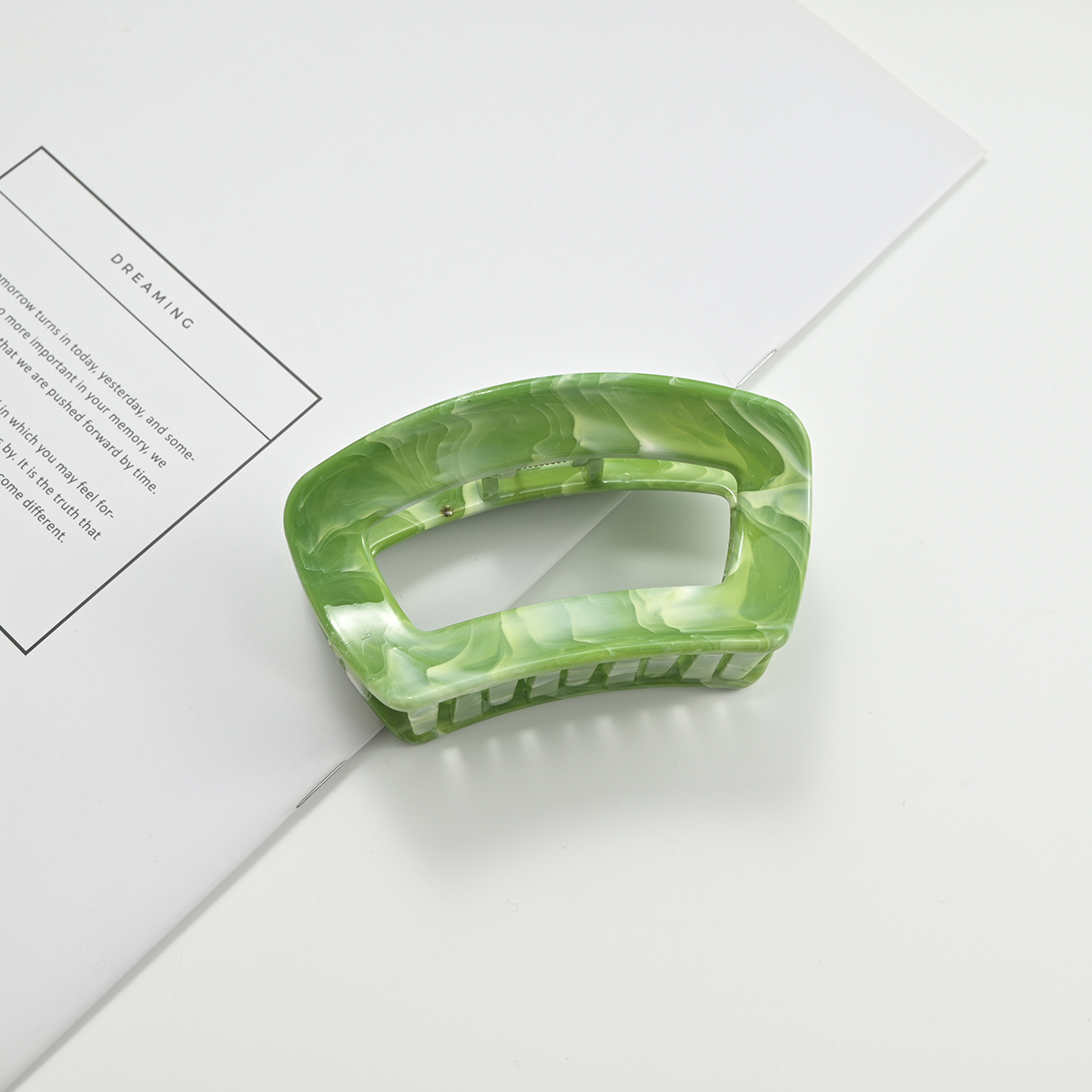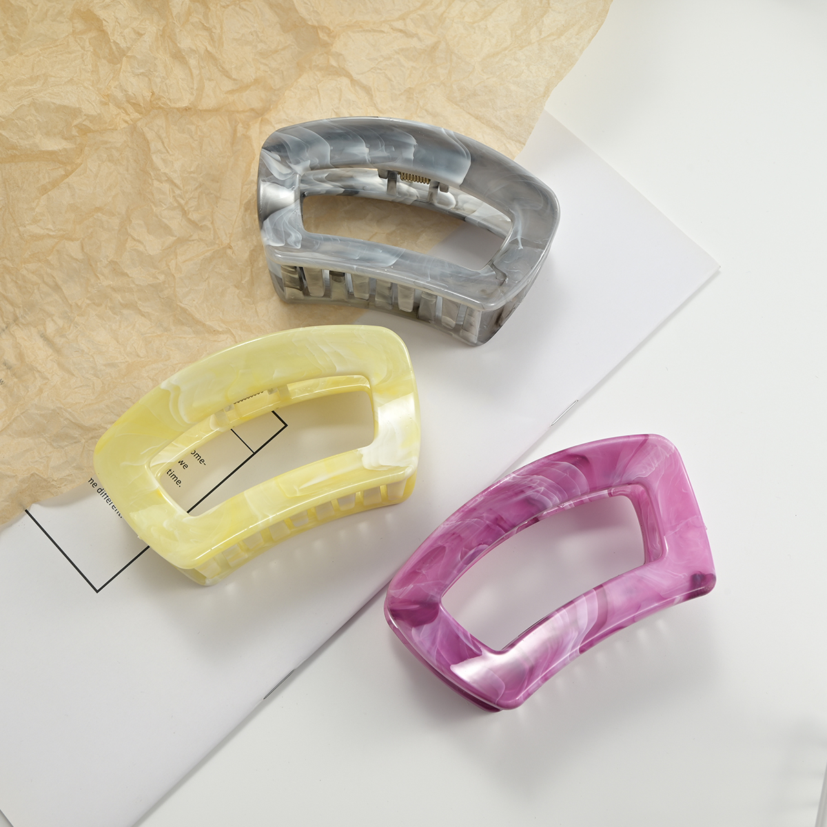 这是一款椭圆镂空大理石纹醋酸抓夹,走的是“复古轻奢+极简高级”路线,适配各种风格穿搭: • 材质与质感:用醋酸纤维打造,自带天然大理石的晕染纹理(绿/粉/棕/灰/紫/黄6色),质感是温润的“玉质通透感”,比普通塑料抓夹更显精致,上手有轻而扎实的分量。 • 设计细节:椭圆镂空框架+宽齿梳,线条简约利落,是近年流行的“轻复古极简风”;齿梳做了密集排布,抓力稳、适配厚发/多发,同时边缘圆润不扯头皮。 • 场景适配:日常通勤搭衬衫/西装显干练,约会穿裙子又能添温柔感,是“低调显贵、不挑风格”的百搭配饰,揣包里随时整理发型也很方便。