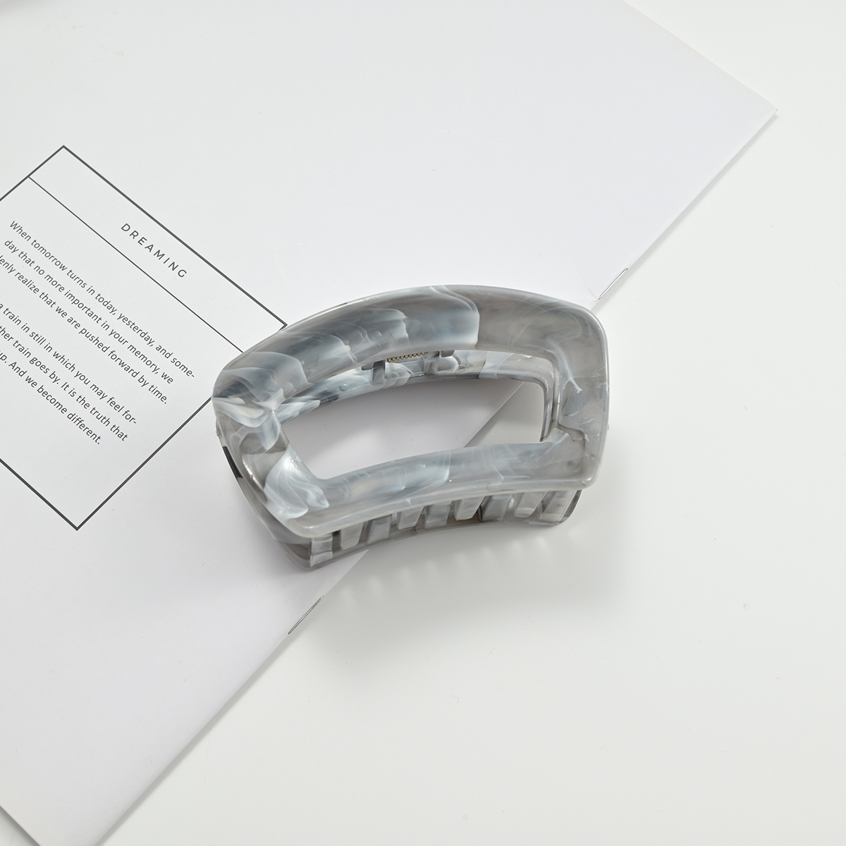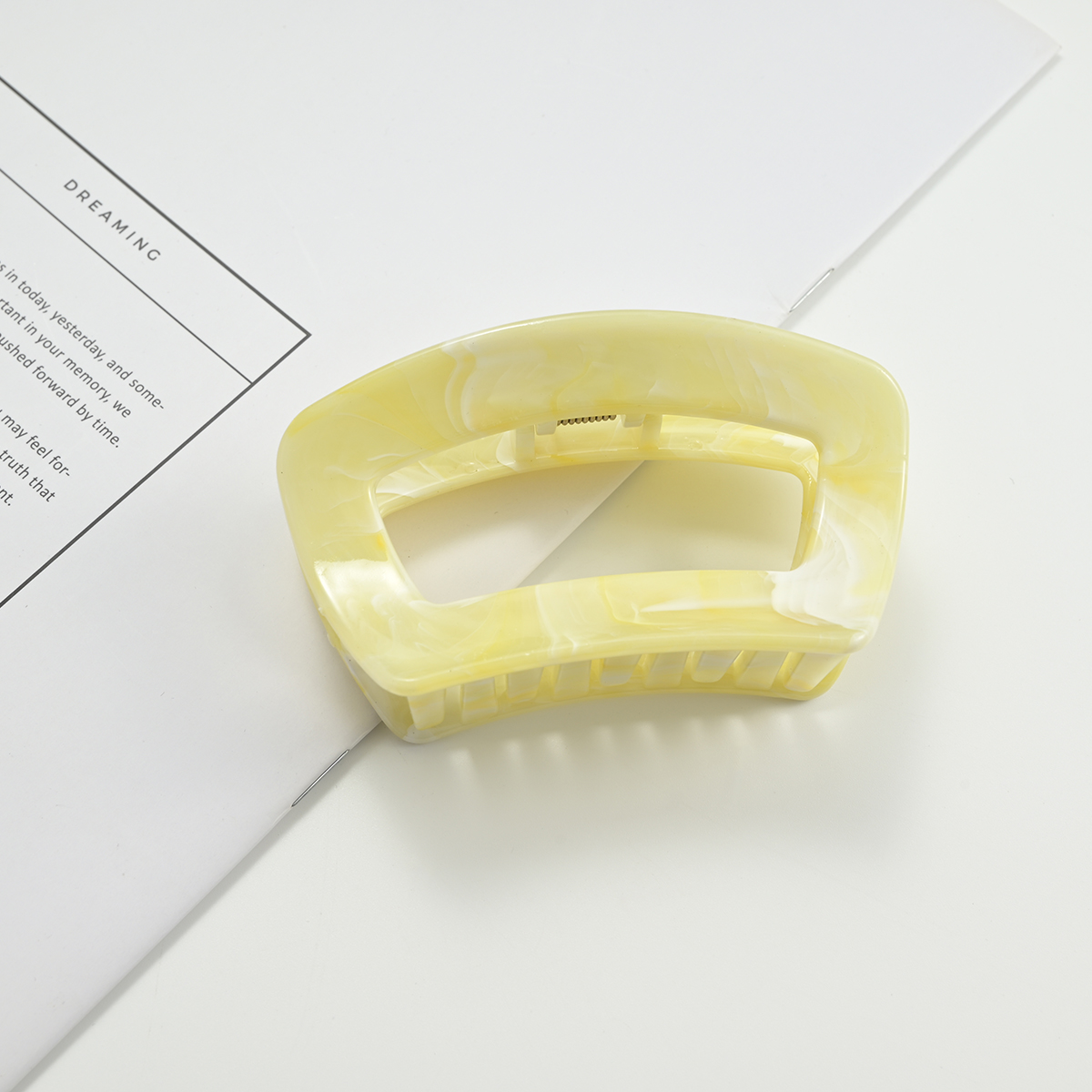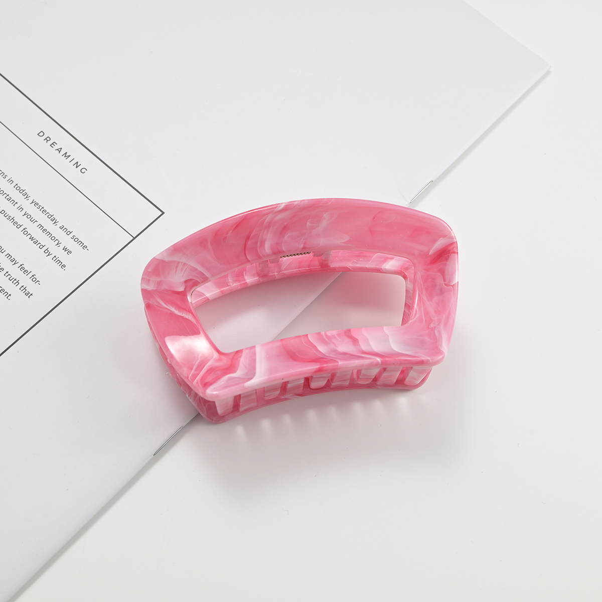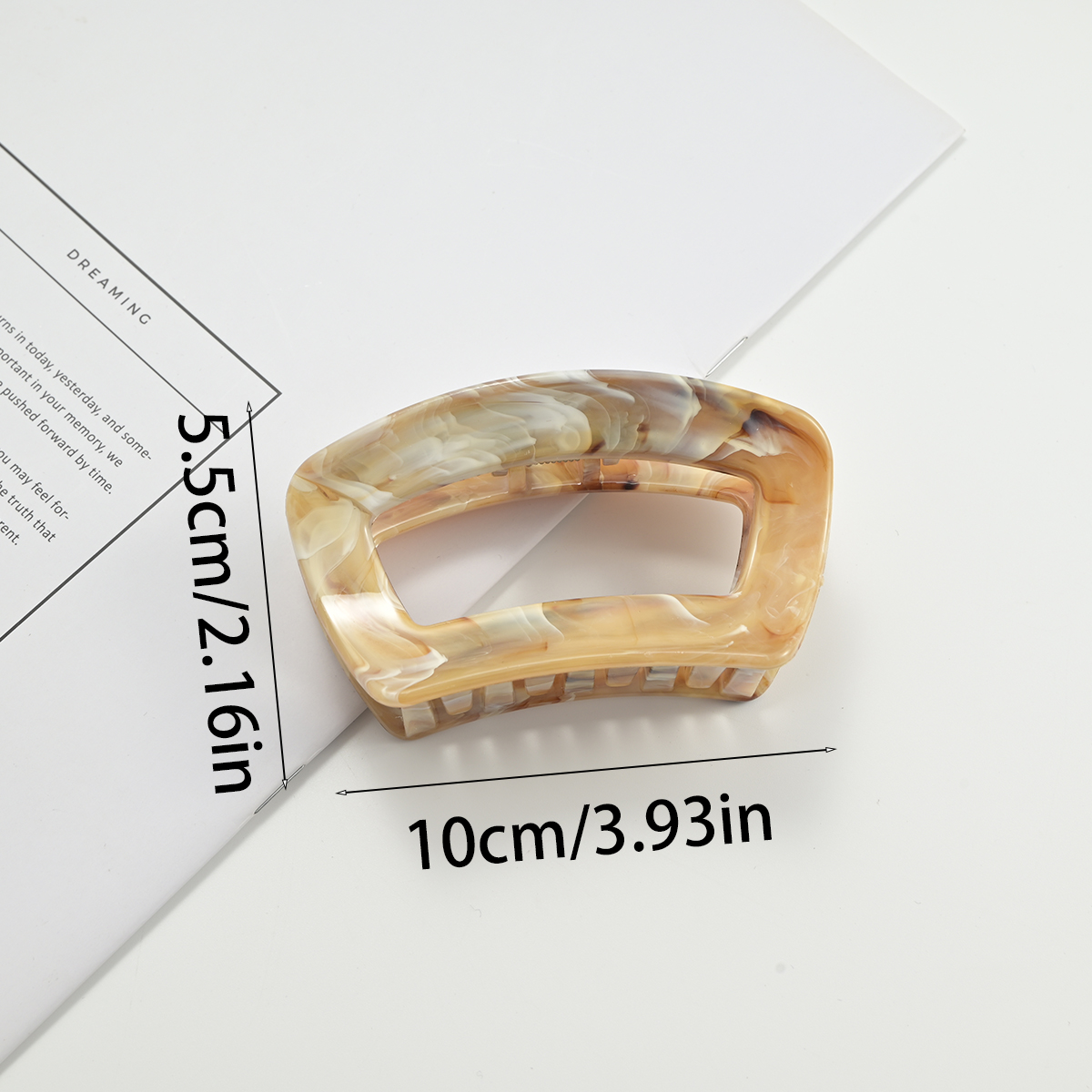 这是一款椭圆镂空大理石纹醋酸抓夹,走的是“复古轻奢+极简高级”路线,适配各种风格穿搭: • 材质与质感:用醋酸纤维打造,自带天然大理石的晕染纹理(绿/粉/棕/灰/紫/黄6色),质感是温润的“玉质通透感”,比普通塑料抓夹更显精致,上手有轻而扎实的分量。 • 设计细节:椭圆镂空框架+宽齿梳,线条简约利落,是近年流行的“轻复古极简风”;齿梳做了密集排布,抓力稳、适配厚发/多发,同时边缘圆润不扯头皮。 • 场景适配:日常通勤搭衬衫/西装显干练,约会穿裙子又能添温柔感,是“低调显贵、不挑风格”的百搭配饰,揣包里随时整理发型也很方便。