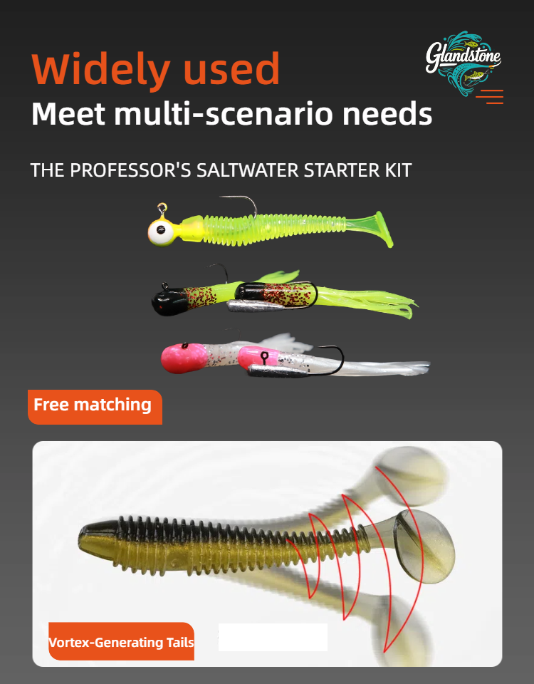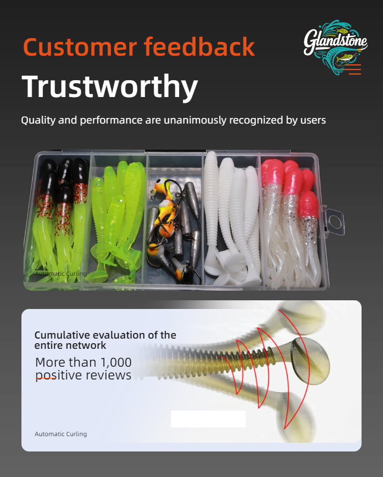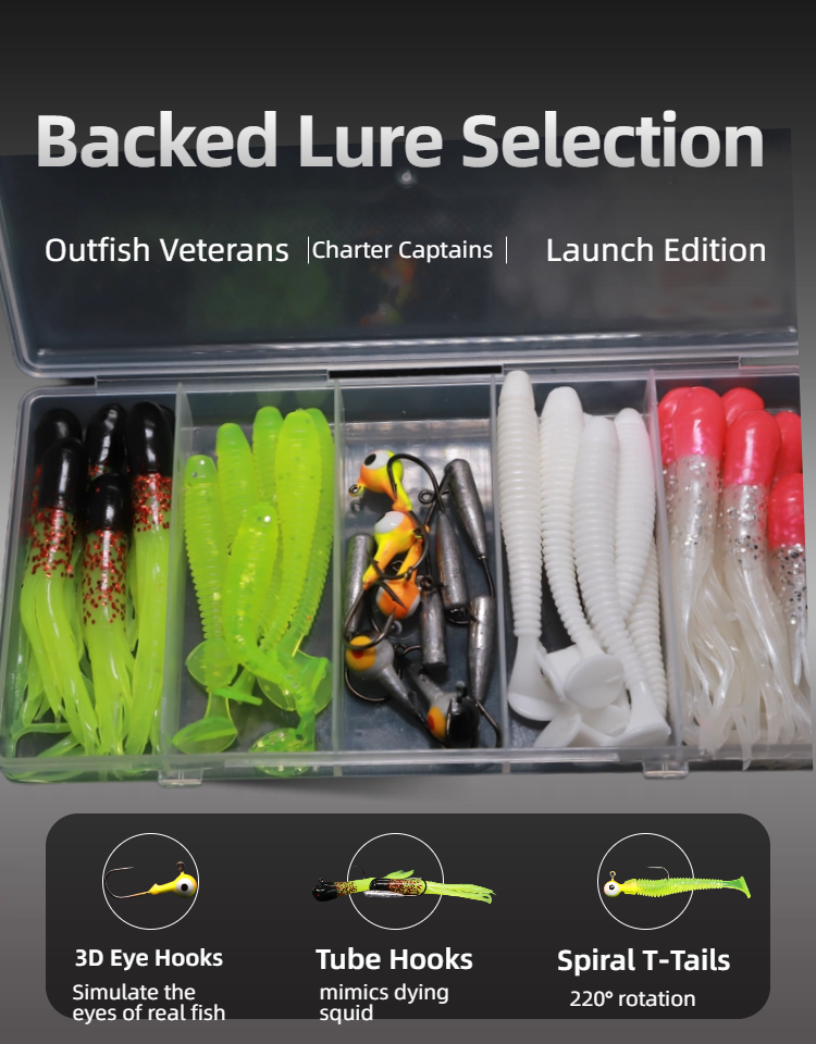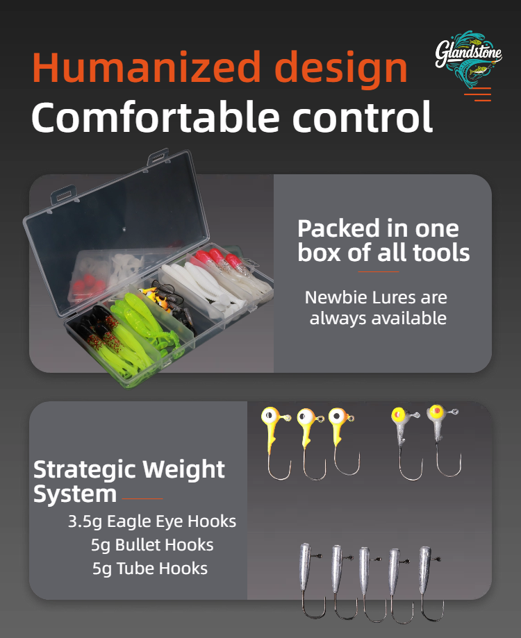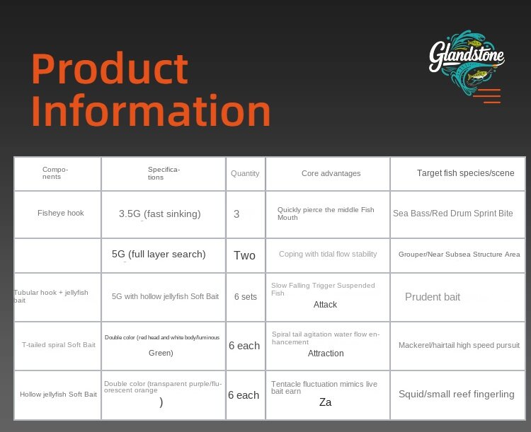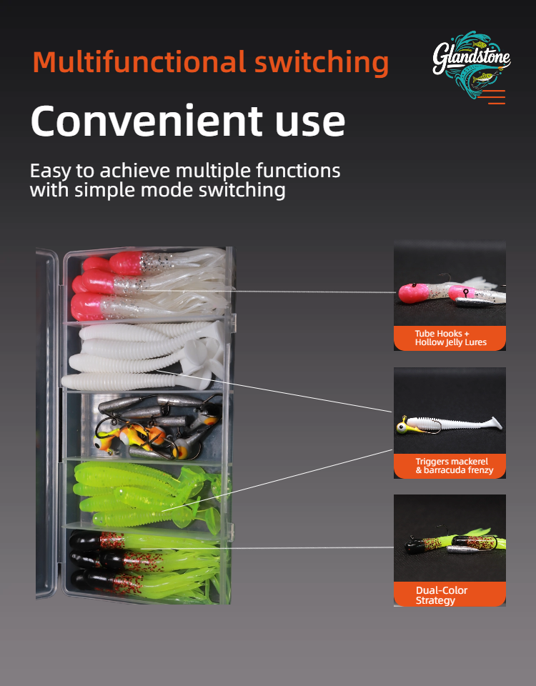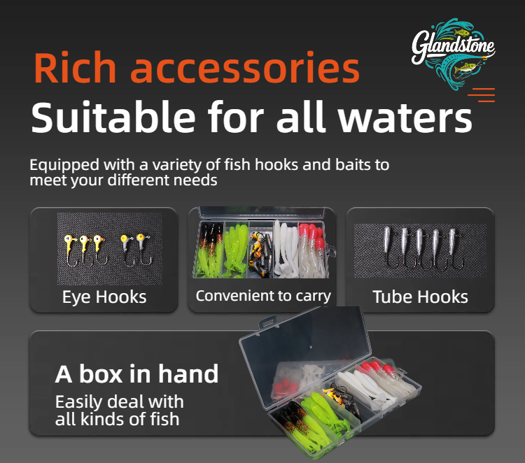 This is a fishing suit Composition and design: including 3D eye hook (simulating real fish eye), imitation squid tube hook (imitating the dynamics of dying squid), spiral T-tail (rotating 220 °) and other types of lute bait, it adopts fluorescent color and simulation design, and is classified and stored with transparent storage box. Usage and advantages: it is suitable for Luya fishing scene, aiming at the eating habits and habits of different species of fish, it attracts fish to bite hooks through realistic forms and dynamic effects, and helps the anglers "surpass the veteran and the captain", it is a practical equipment for novice and senior players in Luya. Scenario adaptation: both fresh water and seawater Luya, aiming at predatory fishes such as bass and mackerel, can improve the success rate of fishing by virtue of various bait types and simulation designs.