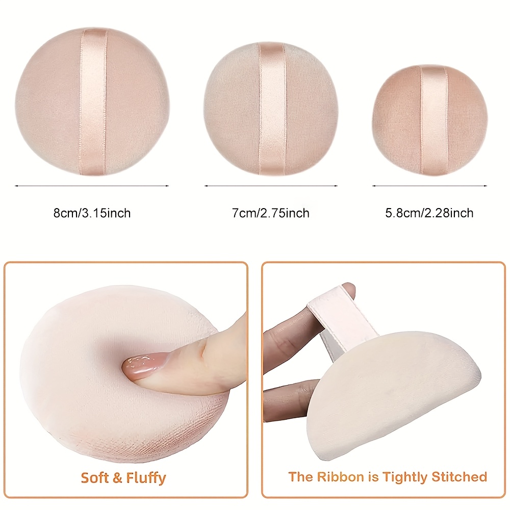 尺寸多样:涵盖大、中、小三种尺寸,可根据面部不同区域(如全脸、局部细节)灵活选择,满足精细化定妆需求。 材质柔软:植绒材质触感细腻亲肤,上妆时不会刺激皮肤,且能均匀抓取粉体,打造出自然服帖的定妆效果。 设计贴心:缎面丝带设计便于手持,避免手指直接接触粉扑污染粉体,同时提升了使用时的便利性和美观度。 用途广泛:适用于散粉、蜜粉、身体闪粉等多种美妆产品的上妆,一套满足全脸及局部的定妆、补妆需求,是美妆工具中的实用好物。 数量充足:6 个装的规格可满足长期使用需求,也方便替换和清洁,保持上妆工具的卫生洁净。